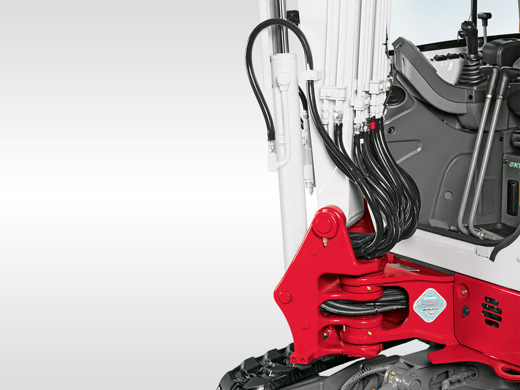 Optional können die Takeuchi Bagger mit dem Schnellkupplungssystem TAKLOCK ausgerüstet werden, mit dem Sie die Hydraulikleitungen für Anbaugeräte wechseln können, auch wenn diese unter Druck stehen.